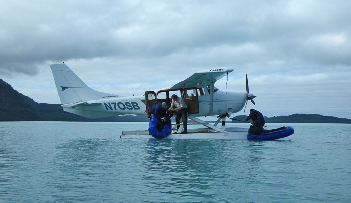 在Glacier Bay National Park(冰川湾国家公园),大多数的土地都被指定为机动车不能进入的旷野。在Glacier Bay(冰川湾)的外面,水上飞机可以在邻近旷野的受保护的海湾降落。水上飞机通常在海滩上将人们放下和接回,但是在风平浪静的日子里,橡皮筏子可以快速地进行“水上接回”。 摄影师: Bill Eichenlaub