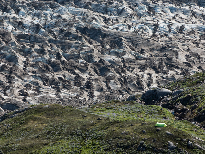 在爬到右下角的露营地之前,我们穿过了这张照片里的冰。选择一条穿越这样复杂地形的路径可能会非常棘手。冰原就像是一条巨大的河流——在“冰川河床”(想想河床)平坦的地方,冰川的表面也是平坦和“光滑”的。在冰经过冰川下的山的地方,冰的表面就是粗糙“有冰隙”的,就像河水的急流一样。在冰川边缘,冰川表面是粗糙还是光滑取决于下伏基岩和冰川所处山谷的形状。 摄影师: Bill Eichenlaub