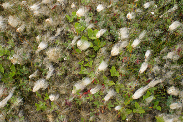 羊胡子草的果实是颗粒状的种子,有一簇簇附着的“棉”会随风传播果实。这天是果实传播的好日子,风很强,天气又干燥。羊胡子草周围的一切,包括这里展示出的睡菜和沼委陵菜 都被“棉”所覆盖。 摄影师: Bill Eichenlaub