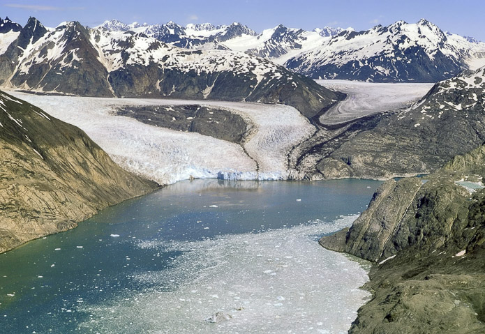 Muir inlet(缪尔湾)的“狗腿”处复合冰体的壮观景象。Riggs Glacier(理格斯冰川)的入海面在1961年就和Muir Glacier(缪尔冰川)的入海面分离了,并且在1967年的时候仍在崩解入海。在那时候,McBride Glacier (马格布莱德冰川)向在右边的Riggs Glacier(理格斯冰川)提供了冰,但是不久后就停止了,因为McBride Glacier(马格布莱德冰川)在它的海湾里消退了,而且其冰平面迅速降低。但是请注意,在McBride Glacier(马格布莱德冰川)冰舌处较老的冰被推进的新冰超越(一个黑色的冰碛是划分线),意味着McBride Glacier(马格布莱德冰川)在总体消退的情况下进行了一次小型的冲击推进。