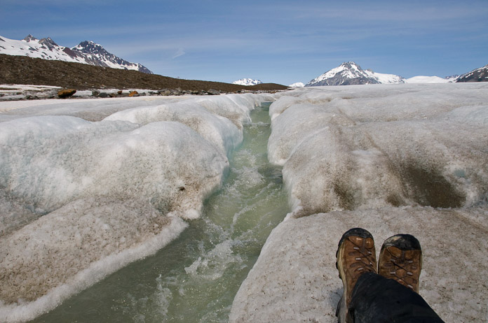 ¡Vaya! ¡Un tobogán natural de agua en un soleado día de verano! ¿Por qué no saltamos y nos deslizamos por él? Lo cierto es que los arroyos de los glaciares no duran mucho. A mis espaldas, el agua se sumerge en un enorme agujero que desaparece dentro del glaciar. Adiós, agua…