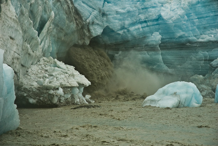 Durante todo un verano, esta "cascada" brotó de la fachada de Lamplugh Glacier (glaciar Lamplugh). Podría dar la vuelta a los kayaks, si sus remeros fueran lo bastante simples como para acercarse demasiado. Tomé esta fotografía desde una playa cercana, y fue lo más cerca del glaciar que pude llegar a pie. Después de disfrutar de la vista por un momento, tuve que regresar corriendo al campamento, a través de la zona intermareal, ya que la marea estaba subiendo y me iba a quedar sin superficie sobre la que correr.
