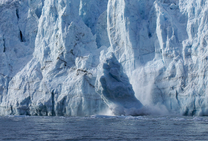 We had risen early to arrive at Margerie Glacier as the sun was coming up, lighting the face from the side. Then we waited. Which is what just about everyone does. It is a Glacier Bay tradition, to sit on a boat in front of a tidewater glacier and wait for it to calve. Not all waits pay off with 'the big one', but many do and regardless it is always time well spent, waiting with the mountains, the sea, the glacier. We got lucky and had just enough warning of small ice bits starting to fall that I was able to catch the moment in motion. The next photo shows the spectacular splash. Photographer: Bill Eichenlaub
