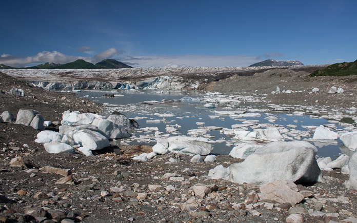 Visitamos este lago represado en el glaciar poco después de que ocurriera un drenaje parcial, cuando los bordes del lago aún estaban cubiertos de barro fresco. Brady Glacier (el glaciar Brady) ha represado este lago durante casi 200 años, y periódicamente libera unas repentinas inundaciones en el extremo del glaciar. Cuando se drena el lago, se forman dos pequeñas lagunas separadas por una morrena. Esta foto fue tomada frente al dique de hielo del glaciar Brady, desde la morrena que divide ambas lagunas cuando baja el agua.