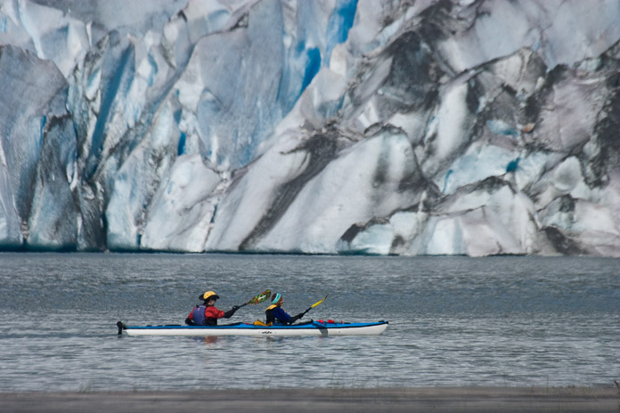 Perhaps the best way to get up close and personal with the Mendenhall Glacier is via kayak. Not so long ago, the face of the Mendenhall was only a short walk away. To reach the face of the glacier today is a much longer hike. The glacier has retreated nearly two miles in the last 50 years and is not slowing down. Photographer: Sean Neilson