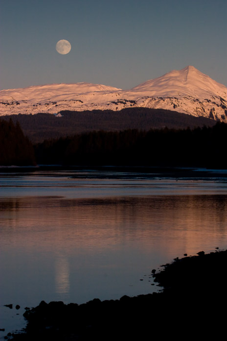 A full moon rises above Bartlett Cove, near the park’s headquarters. Four times a day, the moon in this phase will create some of the world’s most extreme tides. In this photo, we see a “minus” tide of a few feet. In other words, the tide has fallen below the “Mean Low Water” level. This happens around new and full moons. In Glacier Bay, the tides can change as much as 24 vertical feet in just over six hours, creating strong ocean currents and exposing a vast array of sub and intertidal marine life. Photographer: Sean Neilson
