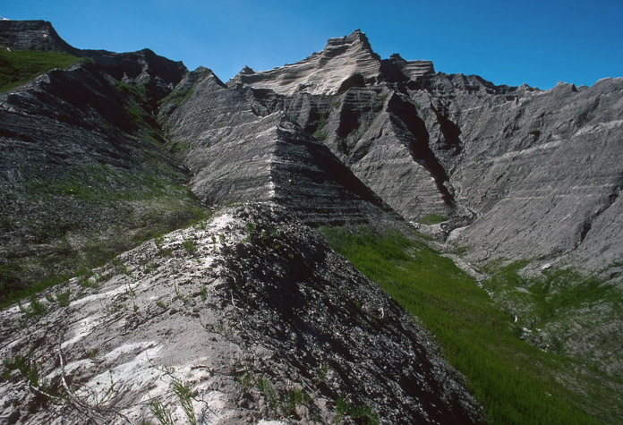 1,500 years ago ice dammed the East Arm of Glacier Bay and a huge freshwater lake formed in what is now the Adams Inlet area. Sediments were deposited into this lake, which lasted for several centuries starting about 1,700 years BP. Today the ice is gone and erosion due to wind and rain is carving the lake sediments into these hills, exposing layers that were once the lake's bottom and deltas built into it. Photographer: Jim Mackovjak