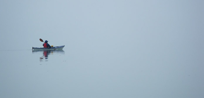 Kayaking in fog - it is eerily quiet, and peaceful. You become acutely aware of the sound of drips from the end of your kayak paddle as they hit the ocean. Distance becomes almost impossible to judge. Time seems to slow. It is a dreamy, mesmerizing new world. Photographer: Bill Eichenlaub