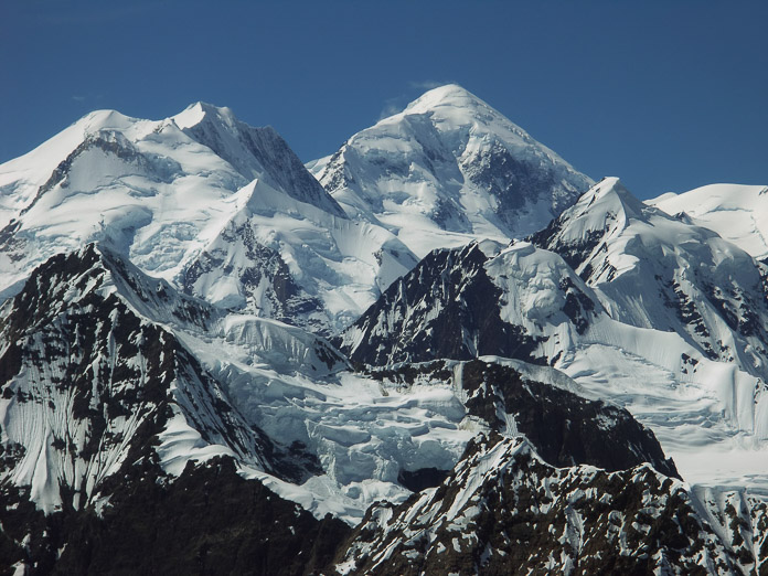 People climb these mountains, but not very often. The mountains' proximity to the ocean makes for wet, cloudy, snowy conditions that change rapidly. Climbers talk of intense beauty, frostbite and hunger. Me, I'm happy with the photo and a warm cup of tea after a delightful overflight. Photographer: Bill Eichenlaub