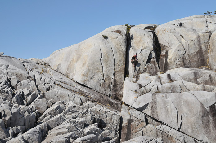 Toe-jammin’ with bear spray. There's not a lot of good rock climbing in Glacier Bay. We are at the boundary of two tectonic plates and our metamorphic rocks are considered by most climbers to be too crumbly for good climbing. Plus we get so much rain it’s usually too wet to get good grips. When we stumbled upon this granite rock outcrop my hiking partner sprang into action, bear spray, intertidal wading boots and all. Photographer: Bill Eichenlaub