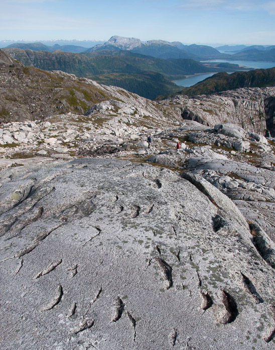 'Chatter marks' are crescent shaped fractures and gouges occasionally found on de-glaciated bedrock. Under a thick glacier, hundreds of feet of ice press boulders down onto bedrock, creating tremendous pressures where they make contact. Scientists attribute chatter mark formation to the irregular movement of boulders against bedrock under a glacier. I usually think of glacier motion as regular and gradual, almost 'fluid', but even in my few years exploring I have witnessed events such as glacier outburst floods and rock avalanches onto glaciers that might cause sudden glacier surges. I wonder if these sorts of events could cause the irregular glacial movements that produce chatter marks. Regardless, simply witnessing these events reminds me that glacier change is not always predictable and gradual. Photographer: Bill Eichenlaub