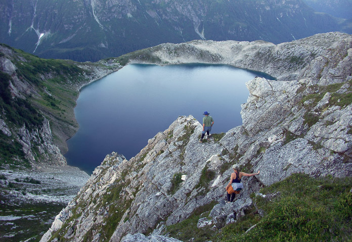 No me gustan mucho las alturas, pero no tenemos que lidiar con ellas la mayor parte del tiempo. Aquí las montañas son tan grandes, que rara vez llegamos a las partes expuestas y empinadas. En esta fotografía nos encontramos en una extremidad, por así decirlo. La tienda de campaña está en la parte baja del otro lado del lago, un pequeño punto de color verde limón. El recorrido alrededor del lago parecía factible, pero “está esa zona gris y empinada…” Cierto, es bastante empinada… - ve despacio- me dije a mí mismo”.