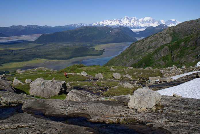 A little dot of a person dwarfed by a spectacular landscape....She captures the imagination and beckons us to get out there and partake. No trails, no guide books here, it is all about what we call 'discovery.' You pick some random hill, figure out a route, try it, turn back when you have to, struggle through the tangles in the lowlands and feast on the vistas in the uplands. Photographer: Bill Eichenlaub