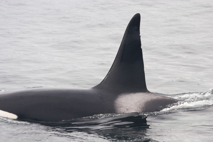While killer whales are frequently found in Glacier Bay waters, they are more seldom seen than humpback whales. Their movements are much less predictable than humpbacks, making a sighting of this species all the more difficult. Researchers photograph the dorsal fin and gray ‘saddle patch’ just below the dorsal fin because these features have unique markings that make each individual identifiable. By comparing photographs over time, researchers are able to patch together data that illuminates the killer whales’ movements, ranges and life histories. Photographer: Sean Neilson