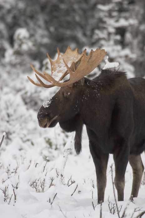 Los alces son unos habitantes relativamente nuevos de Glacier Bay, ya que llegaron en la década de los sesenta. Hace doscientos años, la mayor parte de la bahía estaba bajo el hielo. Conforme se retiraba el hielo, un nuevo terreno quedó expuesto y las plantas comenzaron a establecerse. Una de esas plantas fue el sauce, uno de los alimentos preferidos del alce. Desde la zona de Haines, los alces se dirigieron a la bahía a través de un paso llamado Endicott Gap (la brecha Endicott), que conecta Adams Inlet (la ensenada Adams) con el lado este de Glacier Bay. Este ejemplar se alimenta de los últimos cabos de sauce que quedan por encima de la nieve.