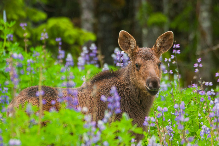 This young moose calf was browsing tender shoots amongst the colorful lupine flowers. Calves are usually born in the last part of May, but are not often seen until their mothers feel confident that the young are big enough to have a chance to outrun predators. Photographer: Sean Neilson