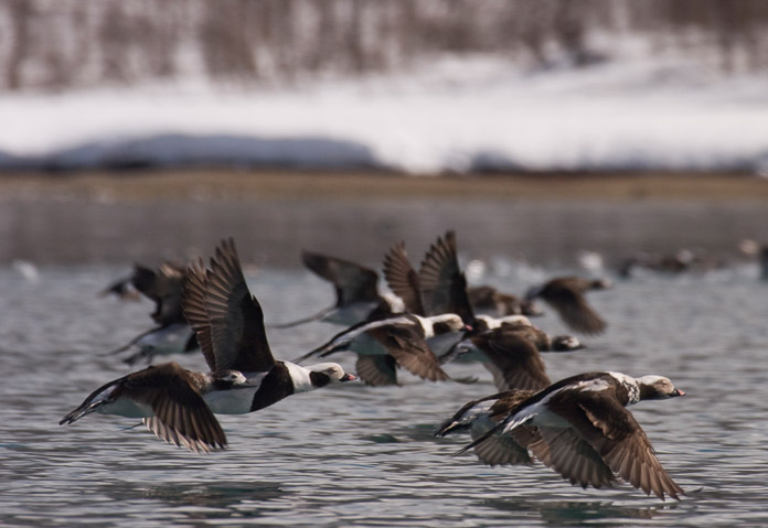 Long-tailed Ducks, formerly called Oldsquaws, congregate into groups of many hundreds of birds during the spring. They have a unique ‘a ah-ah-adala’ call which, when in chorus with hundreds of others, makes for a truly wild sound. These bird are flying just above the water to take advantage of a phenomenon of flight known as “ground effect.” Any bird (or aircraft for that matter) will enjoy greater lift when flying less than half of its wingspan, above the water or ground. For example, if these birds have a two-foot wingspan, they can conserve energy by flying one foot off the water. Photographer: Sean Neilson