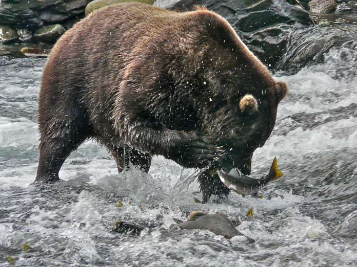 We were counting salmon heading upstream to spawn one day when a female brown bear appeared on the opposite bank. “Does she mind us being here?” we asked ourselves. We kept our distance and watched while she scooped out a fish and took it to the bank to eat, then returned for another and another. She kept a watchful eye on us, but otherwise kept feeding. The salmon did their best to scoot out of her way, but were gathered up at the base of a small waterfall with nowhere to hide. We stopped counting after she had eaten 25 fish and left her to feed in peace. Photographer: Elizabeth Flory