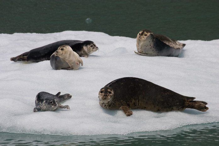 Harbor seals haul out on the ice and rest for extended periods of time. As they lie there, their body heat melts the ice below them. The melted ice then wets parts of their fur coat, making it appear slick and smooth. This effect can be seen on a couple of the seals in this photo. Photographer: Sean Neilson