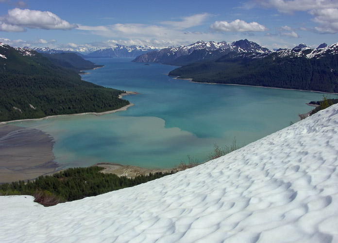 All of the climbing in backcountry Glacier Bay is trail-less, which often means thrashing through alder shrubs, then low thorny salmonberry shrubs and finally out into the open. On this day, it was such a relief to get onto the snow. Lower down we'd been covered with mosquitoes and sweating hard. I was jubilant to be here on a sunny day looking down at Geikie Inlet with the sediments of the Geikie River settling into their new ocean home. This scene is looking northeast down Geikie Inlet, across distant Tlingit Point to Mt. Wright in the clouds. The highest peak on the right is Tlingit Peak. Photographer: Bill Eichenlaub