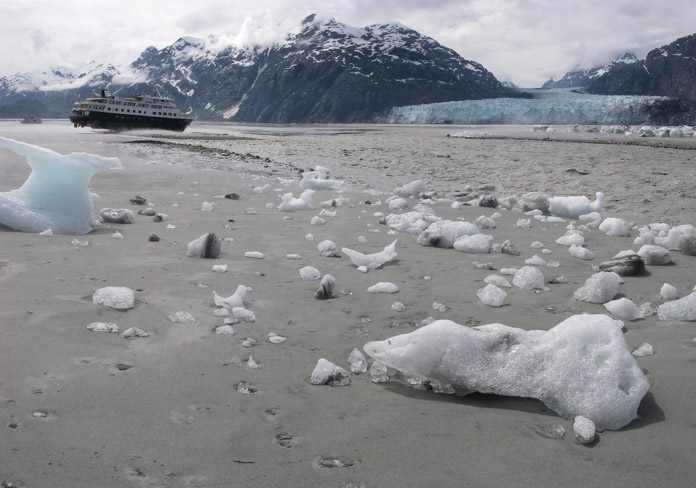 This rare event from 2008 demonstrates how Glacier Bay is a place of very dramatic change. At the time, the official chart showed over 60 feet of water at the position where this small tour boat went aground. Which was accurate when the area was charted. But in the 40-50 years between, the main outlet stream from Grand Pacific Glacier filled this area with mud and rocks. Since this grounding the chart has been updated and this area is now mapped as inter-tidal, which is what you see here. The new chart also contains this warning: "Shoaling may also exist in these areas due to high rates of sediment deposition." The 70+ persons on-board were safely evacuated, the vessel was re-floated and towed to safe harbor. Photographer: Bill Eichenlaub