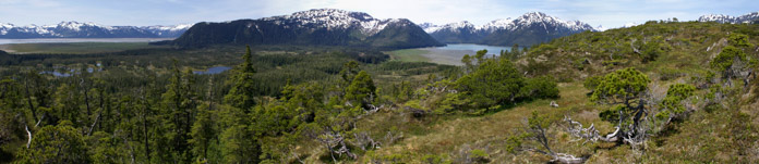 We will often search out muskeg... it can be much easier to hike through semi-open muskeg than through thick shrubs or dense forest. Plus, it's unusual. Its a bit of a 'hobbit-like' landscape. Small pools are linked by little meanders and the stunted pines and cedar are reminiscent of bonsi. Muskegs like this one take many centuries to develop, so we can be confident that even though the Brady Glacier is not far away, ice has not covered this site in a very long time. Photographer: Bill Eichenlaub
