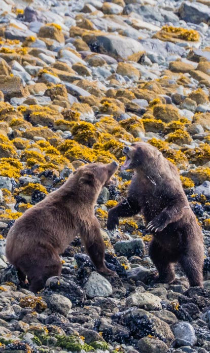 Two brown bears stand and threaten each. Fights like this are not often witnessed. In this case, one bear was defending her twin cubs who crossed paths with a second adult bear in the intertidal / beach zone of Glacier Bay. They went back and forth for what seemed like was a long time, but in reality, the tussle lasted less than a minute. During that time, a lot of information was passed back and forth and the messages were received. Each bear continued on their way as if nothing had happened. Photographer: Sean Neilson