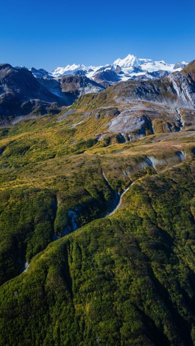 A stark, treeless ridge stretches across the foreground, leading the eye toward the jagged peaks of the Fairweather Range in the distance, their snow-capped summits glinting in the light. This dramatic landscape reflects the dynamic geology of Glacier Bay, shaped over millennia by the advance and retreat of massive glaciers that carved deep U-shaped valleys and fjords into the bedrock. The exposed ridge reveals rocky soils and sparse vegetation, typical of areas recently scoured by ice, while the Fairweather Range itself is part of the Pacific Coast Ranges, formed by tectonic uplift and ongoing fault activity. Together, the ridge and mountains provide a striking visual record of both glacial sculpting and the tectonic forces that continue to shape this rugged Alaskan wilderness. Photographer: Sean Neilson