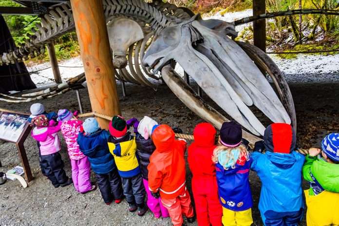 One of the most important recent developments at the park headquarters in Bartlett Cove is the installation of an articulated humpback whale skeleton. These whale bones are an educational opportunity for thousands of visitors each year, and in this case, students from the Gustavus Preschool. Kids and adults alike are able to come here to get a real sense for the immense size of these animals and to learn about their remarkable anatomy as well as their role in the ecosystem of Glacier Bay. Photographer: Sean Neilson
