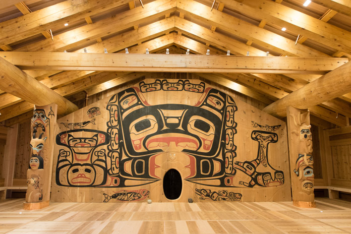 A straight-on view of the house screen and two of the four house posts. Photographer: Sean Neilson