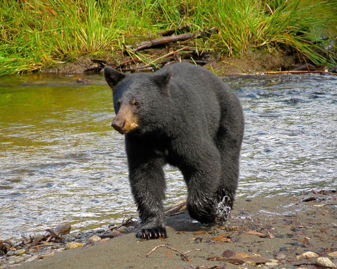 We waited and waited at Steep Creek near the Mendenhall Glacier, hoping a bear might come and feed on the salmon beginning to spawn. A juvenile black bear finally appeared, working her way upstream. All the waiting is forgotten, there is only this moment when the bear is close enough for us to see into her eyes – a thrill we never tire of. Photographer: Elizabeth Flory
