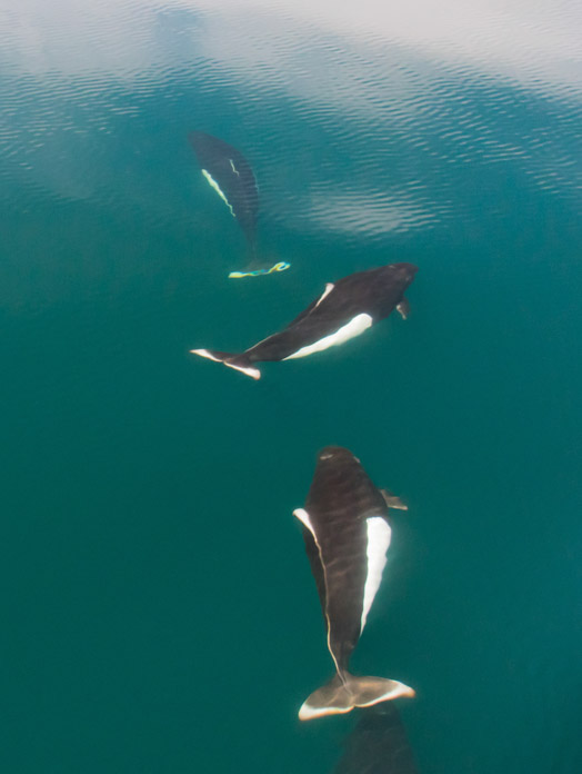 Dall’s porpoises are not usually seen in Glacier Bay, but occasionally are spotted in Icy Strait, just south of the Park’s boundary. They are one of the fastest marine mammals in the ocean, surpassed only by the killer whale, which is their primary predator. As they rocket through the water, they can often be identified by the “rooster tail” splash that trails the fin on their backs. Here several are seen from the bow of a boat as they appear to effortlessly ride the boat’s bow wave at about 10 knots (11.5 mph or 18.5 kph). Photographer: Sean Neilson