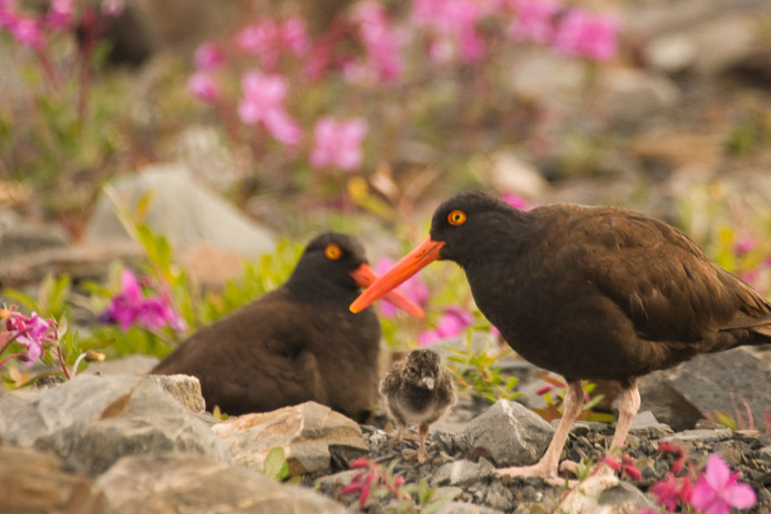 グレーシャーベイ(Glacier Bay)国立公園でクロミヤコドリの雛がかえるのはたいてい六月上旬ですが、この写真の雛がかえったのは八月でした。それは、親鳥がジョンズ・ホプキンス氷河(Johns Hopkins Glacier)の末端間近に巣を作ったためです。このように湾口から離れたところでは、夏は始まるのが遅く、終わるのが早く、「夏」はほんの数週間しかありません。この写真は、私がちょうど氷山の末端近くでキャンプしていた時に、親鳥のオレンジ色の刀のようなくちばしのアーチの下を雛が歩いているところを撮影したものです。 (クロミヤコドリの学名:Haematopus bachmani、俗名:Black oystercatcher) 写真: Sean Neilson
