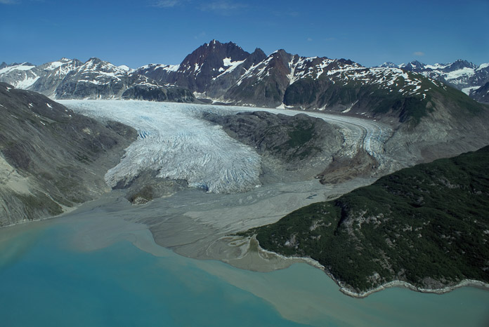 2007年7月19日撮影のリグス氷河(Riggs Glacier)。リグス氷河は最高です。海と接するところは切り立っており、表面は巨大な深い割れ目が入り組んでいます。氷は白く、表面には石が殆どありません。周りには荘厳な山がそびえ、遠くには上部が赤茶色のブラック山(Black Mountain)が見えます。