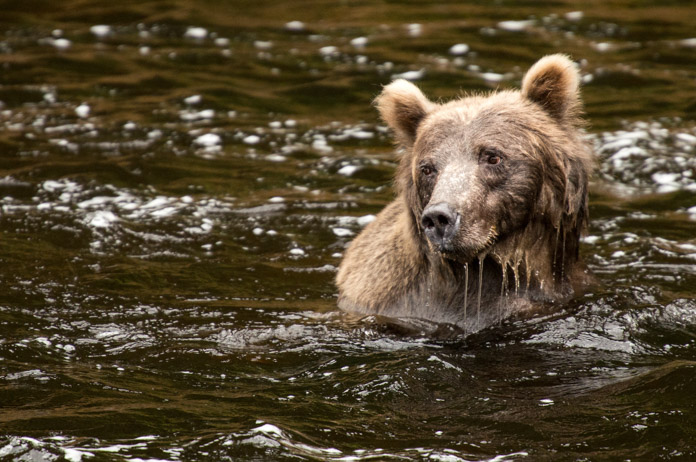 I was hiking up a river on Chichagof island in the rain one wet fall. A few salmon sluggishly swam upstream, but it was a slow start to the spawning season. A mid-sized brown bear came trudging out of the trees, barely eyeballing me before plowing straight into the center of the river. There it sat, up to its neck in water, watching. And waiting. Sometimes it dipped its head underwater to look for fish swimming past, but there were so few that it gave up the hunt for live fish and moved on to the dead. Apparently there were a quite a few rotten salmon on the bottom of the river. The bear pulled these up one at a time, held a rank fish delicately in its claws, and chewed the decaying flesh with an air of contentment. Photographer: Emily Mount