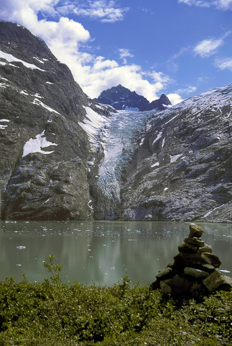 The view across Johns Hopkins Inlet to Kashoto Glacier on July 14, 1967. Over a period of more than 60 years beginning in 1925, Dr. Bill Field kept faithful track of glacier activity throughout Glacier Bay from a series of photo stations at key vantage points. More than any other person, Dr. Field is responsible for our precise knowledge of ice behavior in the park. His patient record forms the foundation for all other studies of glaciology and biology that have subsequently made Glacier Bay famous. The rock pile marks Photo Station Number 9. Photographer: Greg Streveler