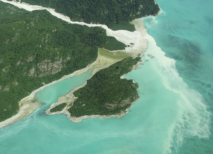 ¡Limo! ¡La harina glacial! Al caminar por los torrentes del sandur glacial, las botas suelen cubrirse con una pegajosa capa de barro gris. Donde las corrientes glaciares fluyen rápido, llevan consigo una carga de cieno tan densa que apenas puede uno verse la mano a un par de centímetros de la superficie. Cuando la corriente que aquí se muestra llega al océano, el agua limosa se mezcla con agua de mar, y es empujada por la marea entrante hacia Wachusett Inlet (la ensenada Wachusett). Al bajar la marea, la arremolinada mezcla se ve impulsada en dirección inversa, y desemboca en Muir Inlet (la ensenada Muir).