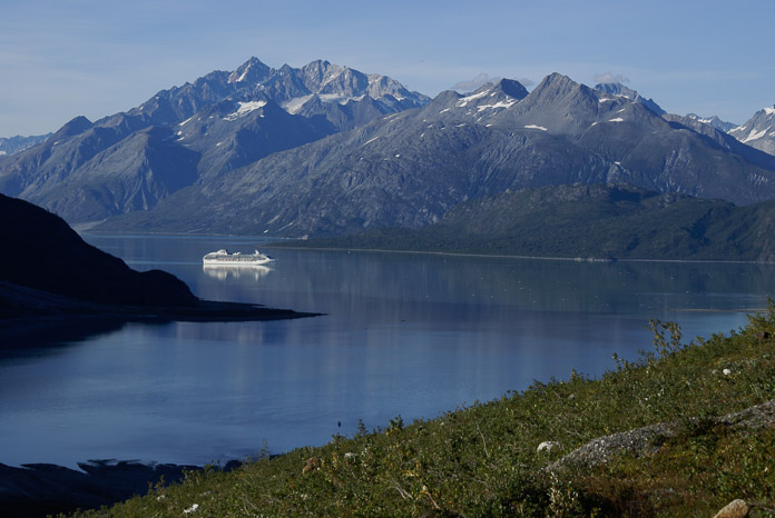 Hundreds of thousands of people visit Glacier Bay each year and pass along the strip of water through which this cruise ship transits. I'd guess that 20 people or fewer stand within a hundred yards of where I took this photo each year – and I wouldn't be surprised if only a handful of boundary surveyors and geologists are the only people to have ever stood atop the 8,214 foot summit of Mt. Barnard, the high peak above the ship. This rugged mountainous landscape is a difficult place to visit...green in this early September photo, but for half the year cloaked in deep snow and bone-chilling cold. Photographer: Bill Eichenlaub