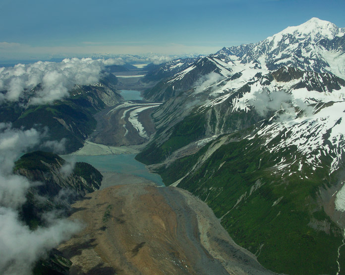 デソレーション渓谷(Desolation Valley)。北米と太平洋の地殻構造プレートが合うところで頻繁に地震があり、ここでキャンプをすれば、崩れ落ちる岩の音で夜目が覚めることもあります。赤茶色と灰色の岩に覆われた部分は、ノース・クリヨン氷河(North Crillon Glacier)です。高山から岩屑を運んだ氷は殆ど見えません。ノース・クリヨン氷河の向こうにリツヤ湾(Lituya Bay)が見え、その先にはリツヤ氷河(Lituya Glacier)の末端が縞模様に見えます。右手の一番高い山はフェアウェザー山(Mt. Fairweather 4669m)です。リツヤ湾からフェアウェザー山頂まで直線で結ぶと25キロメートルの距離です。