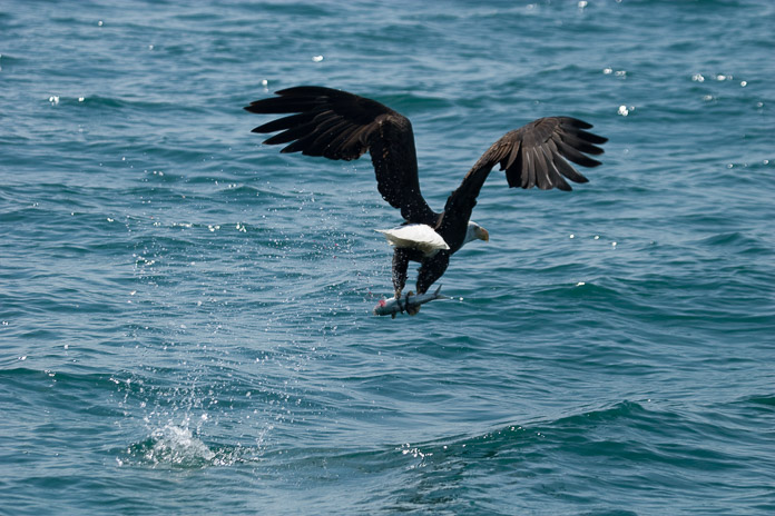 ハクトウワシ(白頭鷲)。木や氷山の上に止まっているものや飛んでいるものなど、ハクトウワシはグレーシャーベイ(Glacier Bay)のあちこちで見られます。空中から急降下して水中の魚を掴み上げるのは有名ですが、実際にそれを目にするのは珍しく、その写真を撮ることは更に困難です。この写真はグレーシャーベイ国立公園南端近くで小舟上から撮ったものです。拡大してみると、ワシの羽から落ちる水滴に混じって魚の血が飛び散っているのが見えるでしょう。写真の魚は、尾が二つに分かれているところから、サケではなく、大きなニシンだということが分かります。