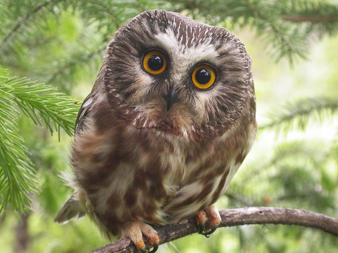 This Northern Saw-whet Owl was looking at the photographer with apparent concern as he prepared to check her nest to count how many eggs she was incubating. Northern Saw-whet Owls nest in cavities, usually abandoned woodpecker holes, although this owl was using a man-made nest box. Average clutch size is about five eggs. It takes two months from when the first egg is laid to when the young owls are ready to leave the nest. Throughout the nesting process the male owl lives nearby and delivers prey to the nest for the female and young. This owl returned to the nest shortly after the photo was taken and her young were successfully raised by the two parents. Photographer: Nat Drumheller